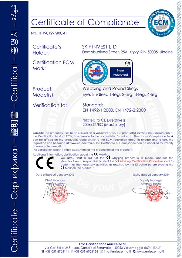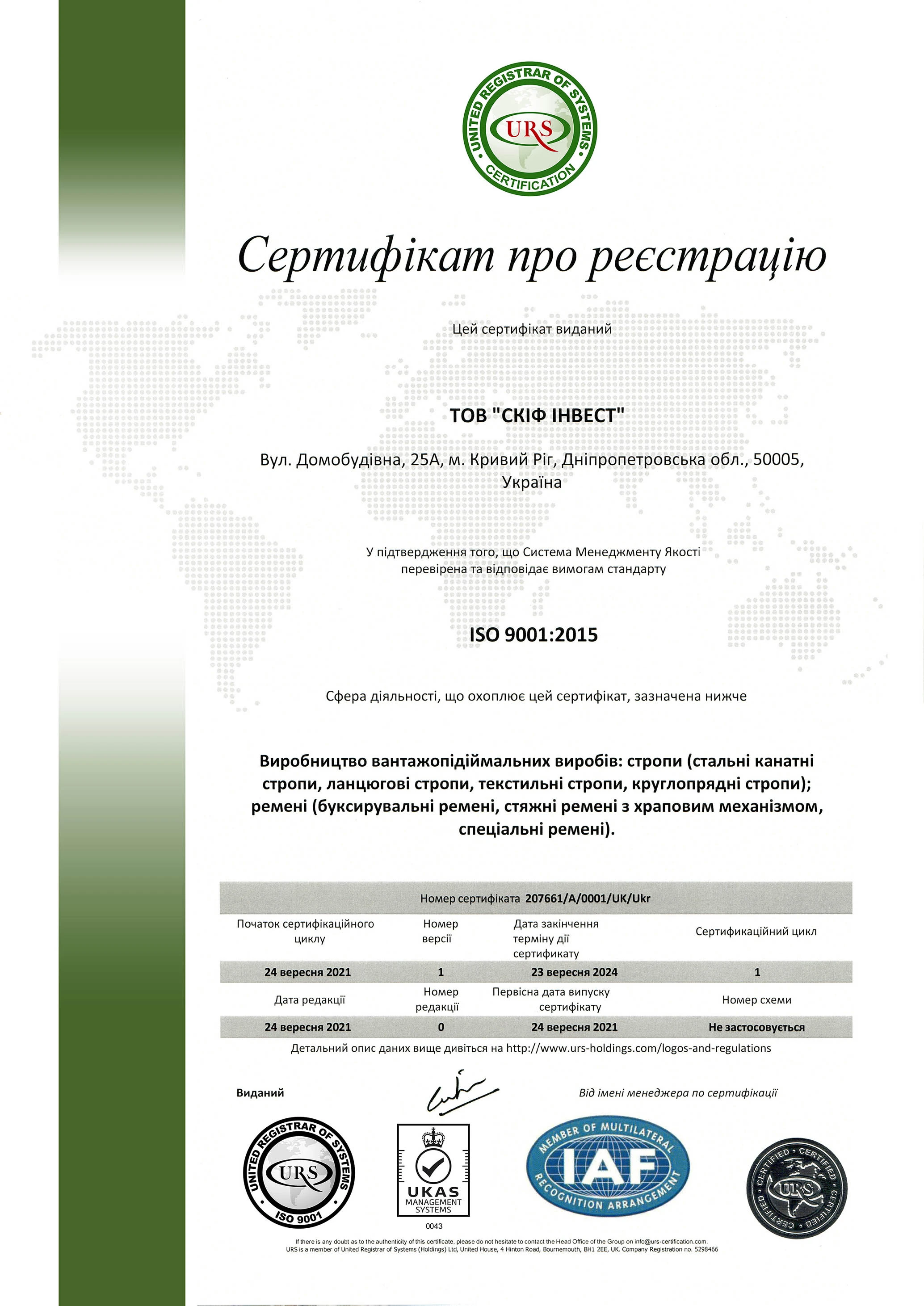 Наша компания является единственным в Украине производителем грузоподъемных стропов и оснастки, прошедшим настоящую сертификацию системы менеджмента качества ISO 9001:2015 аудиторскими группами TUV Rheinland и UKAS.