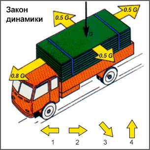Силы, действующие на груз во время передвижения автомобиля (при нормальных условиях)