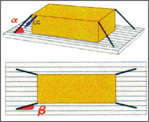 He трудно заметить, что эффективность этого метода зависит от угла α. Кроме того важно, чтобы средства крепления во время транспортировки были постоянно натянуты. Поэтому для предохранения грузов путем увеличения силы трения следует использовать качественные пружинистые материалы, а значит ремни из искусственных волокон. Цепи и стальные канаты не держат натяжки продолжительное время и после нескольких километров движения необходимо натягивать их заново. Величина силы трения, в свою очередь, зависит от двух факторов: силы вертикального прижатия груза к платформе и коэффициента трения, обозначенного μ, который в свою очередь зависит от шероховатости поверхности груза. Свое влияние имеет также покраска, грязь в кузове, а также подвеска автомобиля.